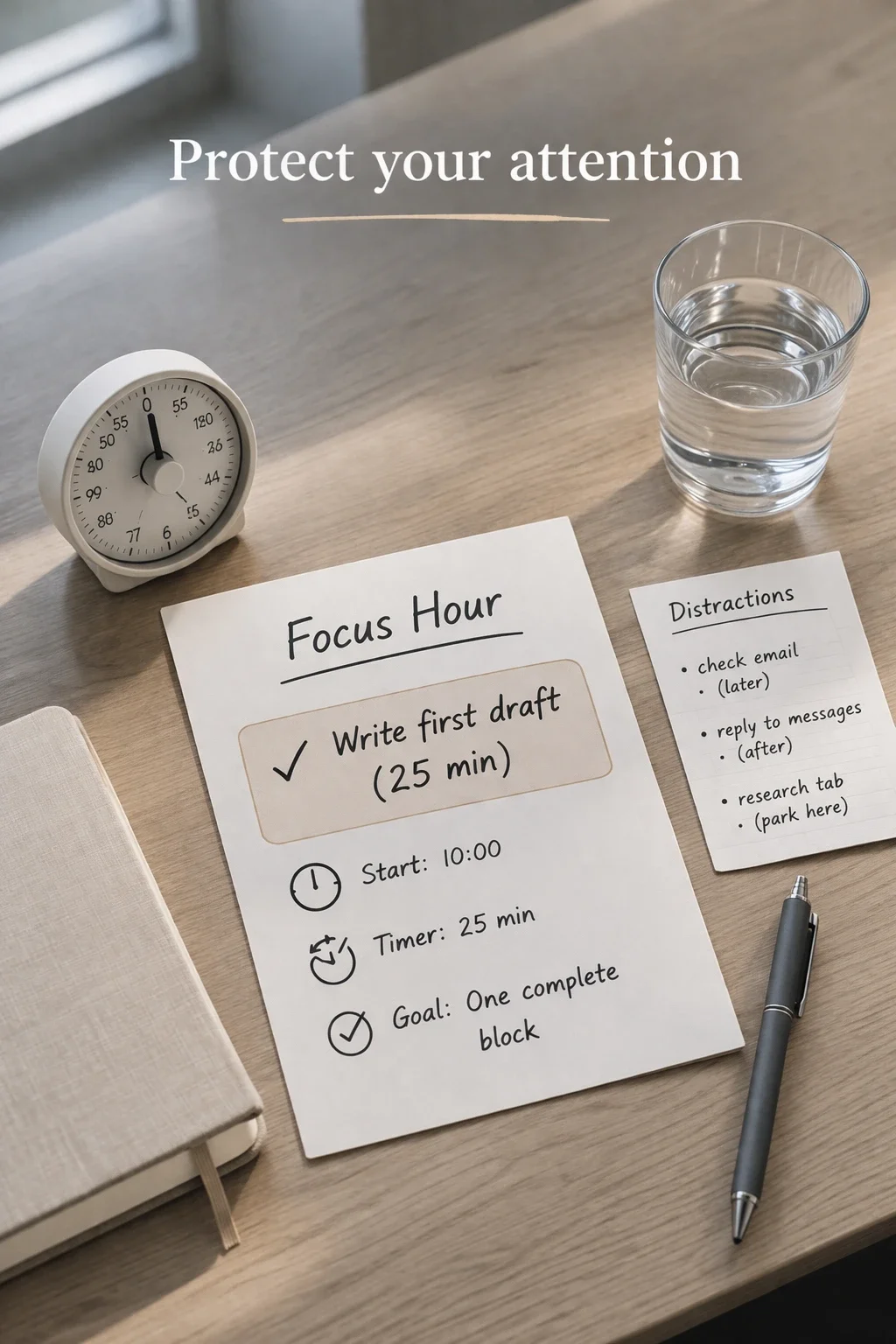 Think of your focus hour as a sanctuary, an intentionally protected space where the rule is simple: one task, one time block, one finish line.